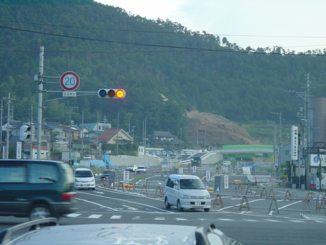 工事中の可部バイパス。車から写しました。 横切っている車は191号線を走っている車です。 左手奥には元ジャングル温泉の場所。今は安佐北区民文化センターがあるところです。 この新しい道はここから南原口を通って上根峠までぬける予定です。 2001.9.10 7:00頃