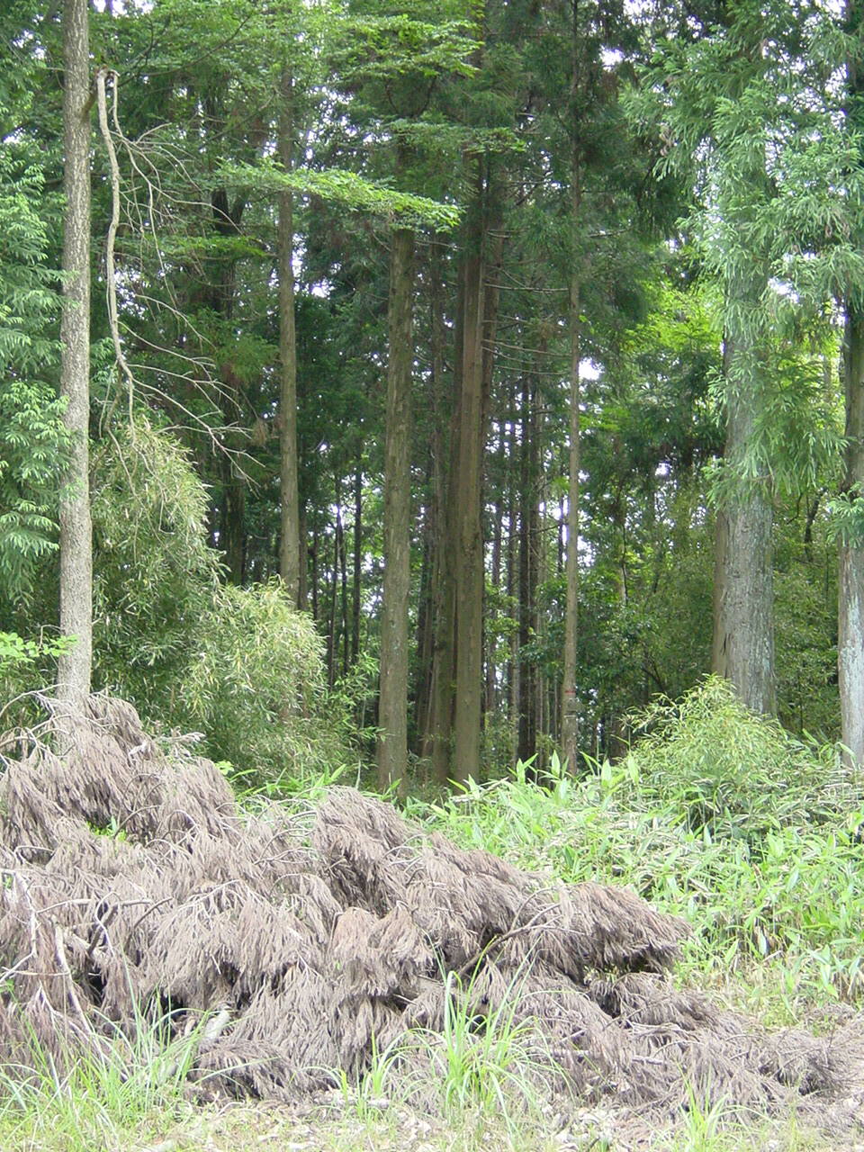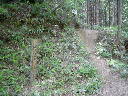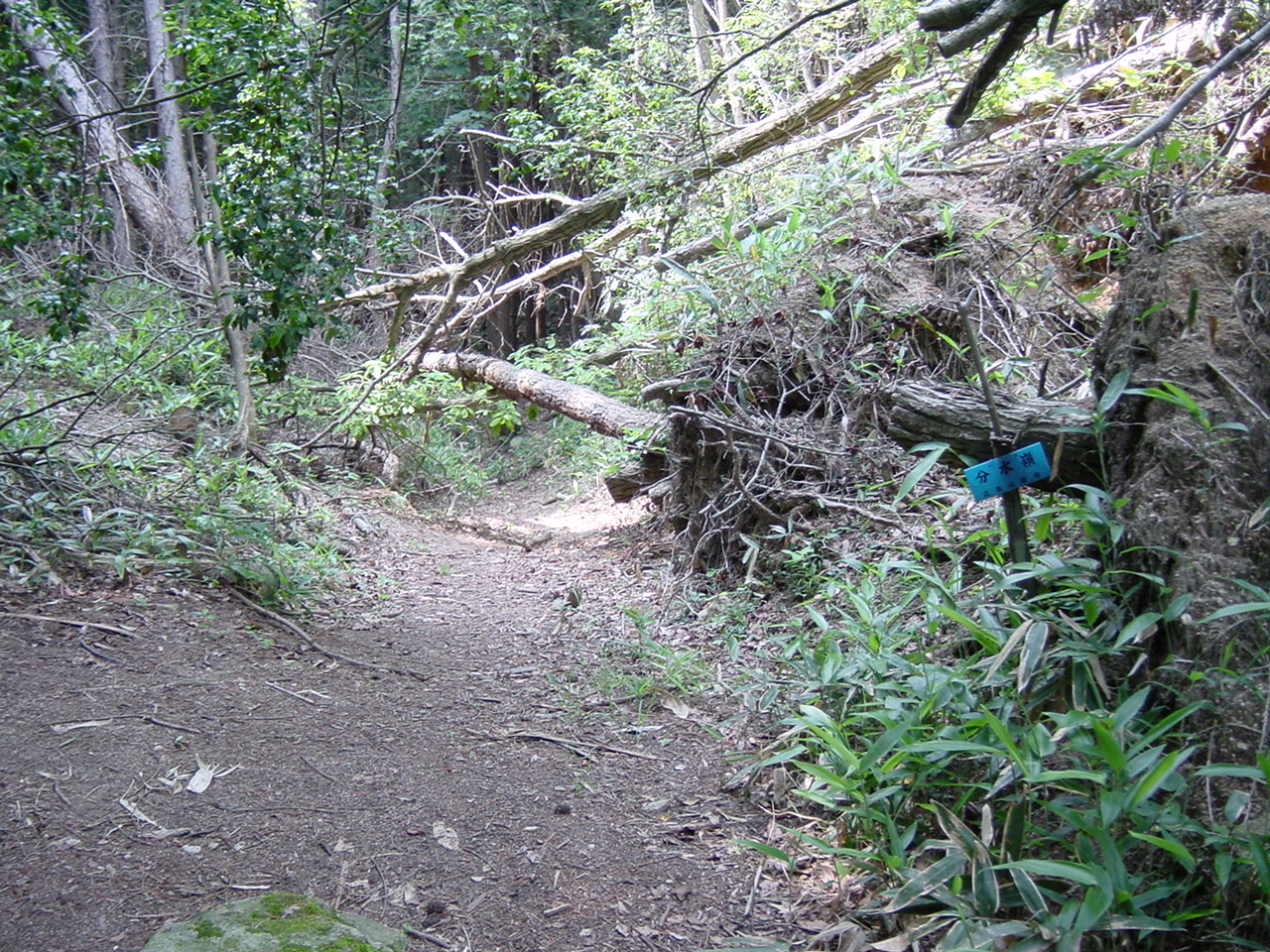 登ってきた道、倒木方向を振り返る。ここは分水嶺。