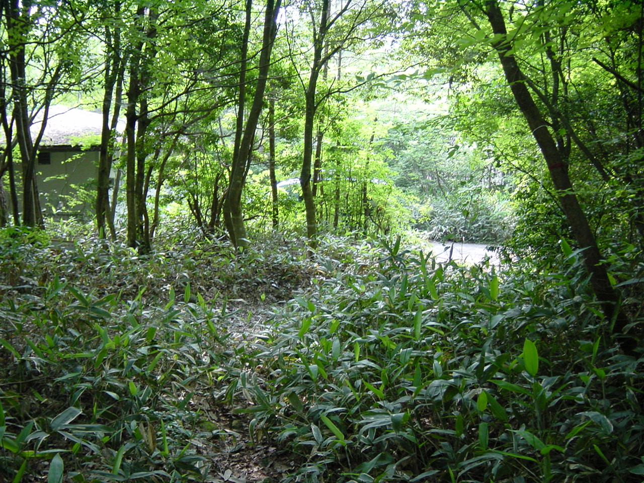 舗装路手前。笹が茂り踏み跡がわずかにわかる程度。