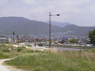 太田川の土手から福王寺山方向を見た。 この辺りは、藤の森。右の大きな道路が可部バイパス。 右手の道路端には、お寿司屋さんやラーメン屋さんなど 郊外型の食べ物屋さんがいくつもできている。 子供の頃、この辺りはすべて田圃で、私たちの運動場だった。 2000.秋