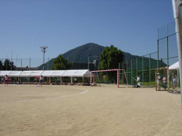 運動場から東山方向。テントの向こうに昔からある高鉄棒。